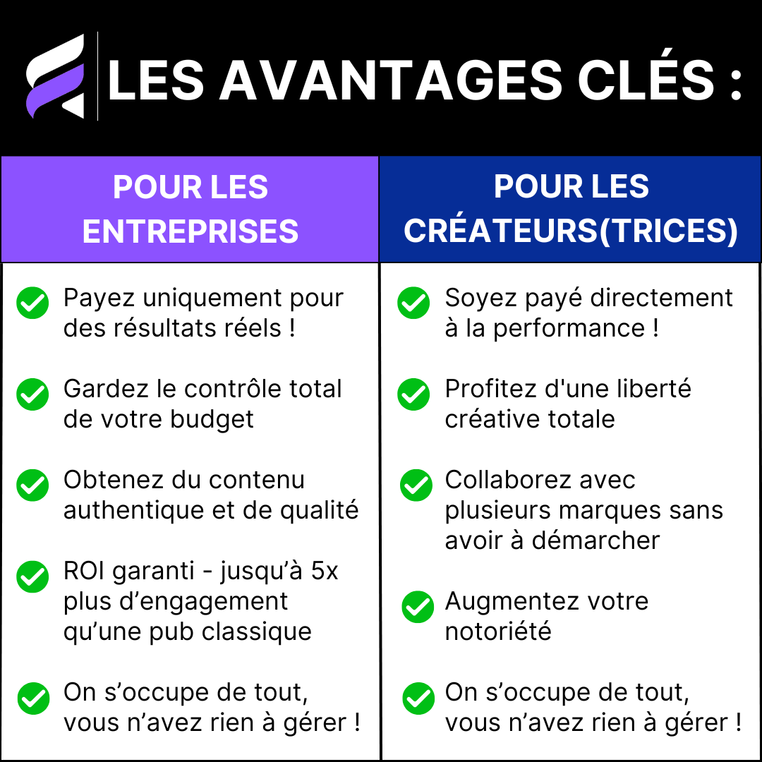 L'entreprise paie uniquement pour les vues réelles générées. Plus la vidéo devient virale, plus l'entreprise génère instantanément de la visibilité et de l’engagement autour de sa marque pour attirer ses futurs clients. Et plus le/la créateur(trice) de contenu gagne de l'argent.